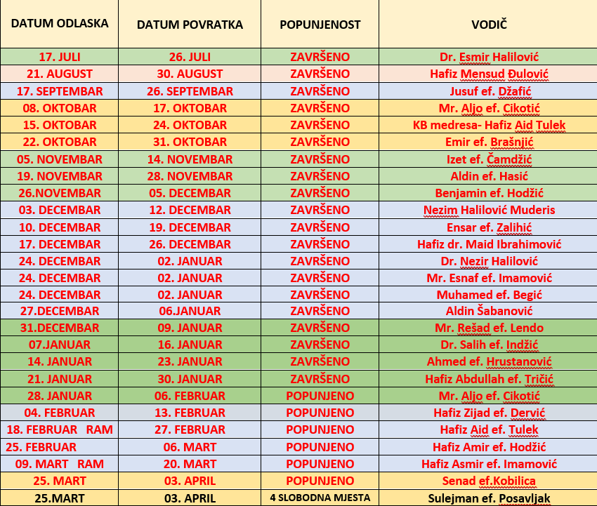 Obavještenja, Umra, Vijesti PLAN PUTOVANJA NA UMRU U SEZONI 2025/26. Redakcija, 28.08.2025 PLAN PUTOVANJA NA UMRU U SEZONI 2025/26. Ažurirano 20.01.2026. Prijave i rezervacije putem sljedećih telefona: +38733289797 ili +38761893036 (WhatsApp, Viber) Obavještenja, Vijesti KONKURS ZA VODIČE NA HADŽU 1447./2026.GODINE Pravilnik o organizaciji hadža Opći uvjeti putovanja na hadž Related posts Vijesti Tribina “Hadž iz Bosne i Hercegovine” Redakcija, 30.07.2020 Umra Druga umra u novembru 2022. Redakcija, 30.09.2022 Vijesti Specijalni program za bh. hadžije povodom Dana Arefata Redakcija, 08.07.2022 Obavještenja, Uncategorized, Vijesti Umra od 22.09. do 02.10.2023. Redakcija, 24.08.2023 Vijesti Bosanskohercegovačke hadžije stigle u Mekku Redakcija, 30.06.2022 Vijesti Na Arefatu sve spremno za bosanskohercegovačke hadžije Redakcija, 06.07.2022