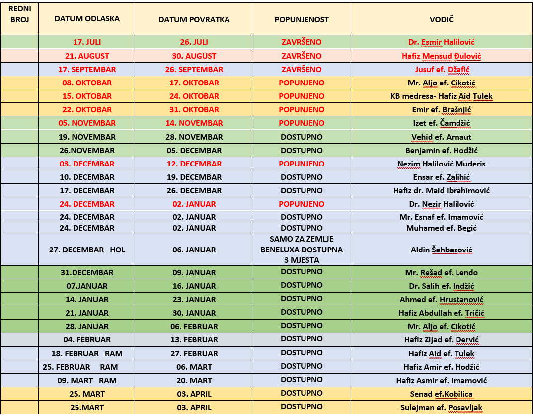 Obavještenja, Vijesti PLAN PUTOVANJA NA UMRU U SEZONI 2025/26. Redakcija, 28.08.2025 PLAN PUTOVANJA NA UMRU U SEZONI 2025/26.Prijave i rezervacije putem sljedećih telefona: +38733289797 ili +38761893036 (WhatsApp, Viber) Obavještenja, Vijesti KONKURS ZA VODIČE NA HADŽU 1447./2026.GODINE Pravilnik o organizaciji hadža Opći uvjeti putovanja na hadž Related posts Vijesti I ove godine bez organiziranog odlaska na hadž iz BiH Redakcija, 12.06.2021 Vijesti Održana edukacija za hadžije 14. grupe iz Muftijstva zeničkog Redakcija, 20.04.2025 Obavještenja, Vijesti Obavještenje o organizaciji hadža 1443.h./2022. godine Redakcija, 20.05.2022 Vijesti Prijave za odlazak na umru od 13. do 24. februara Redakcija, 13.01.2020 Vijesti Saudijska Arabija: Ovogodišnja organizacija hadža uspješna Redakcija, 14.07.2022 Vijesti Hadžije na džemretima drugi dan Kurban-bajrama Redakcija, 10.07.2022